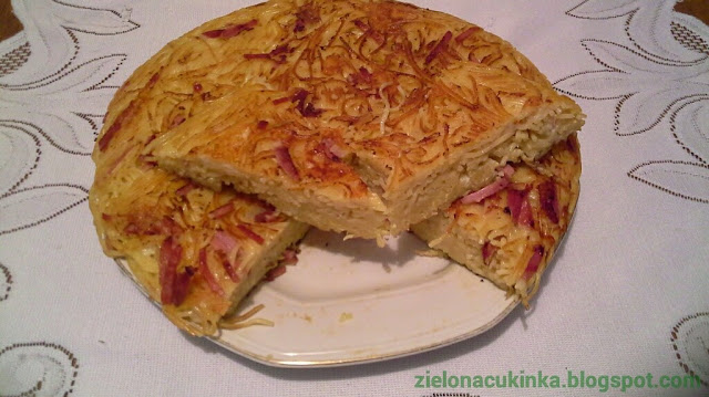 Zapiekanka makaronowa z sosem beszamelowym, groszkiem i boczkiem